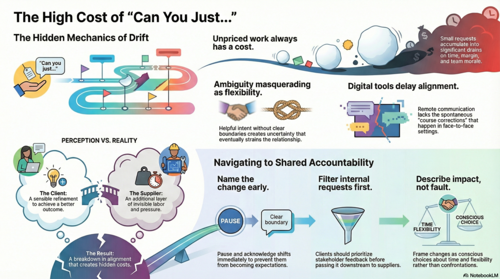 Over time, small requests begin to accumulate. Each one carries a cost, even when it appears minor. Extra hours. Reworked thinking. Extended timelines. Opportunity cost as other work is delayed or compressed. Individually, these costs feel manageable. Collectively, they compound.